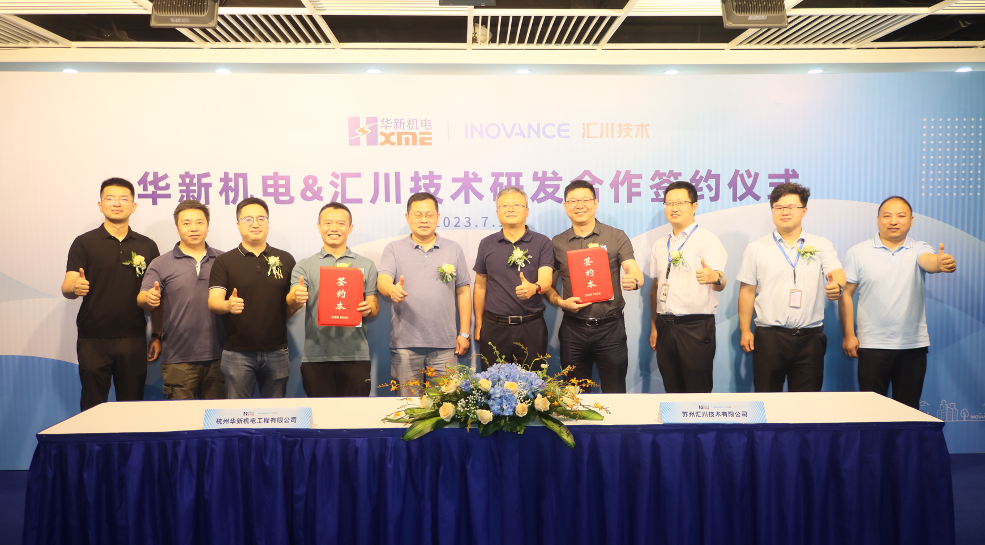 2023年7月12日,江蘇蘇州,杭州華新機電工程有限公司和蘇州匯川技術(shù)有限公司舉行了研發(fā)合作協(xié)議簽署儀式,華新機電副總經(jīng)理沈策和匯川技術(shù)重工裝備SBU總裁王小杰作為雙方代表,在華新機電總經(jīng)理王吉如和匯川技術(shù)聯(lián)合創(chuàng)始人、匯川書院院長張衛(wèi)江的見證下,簽署了雙方在“電力系統(tǒng)裝備國產(chǎn)化關(guān)鍵技術(shù)研發(fā)”的戰(zhàn)略合作協(xié)議。