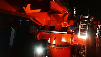 池州項目螺旋卸船機是國內(nèi)首臺安裝于躉船上的創(chuàng)新設(shè)備,此項目單臺卸船機裝卸效率可達800噸/小時。其設(shè)計需克服躉船橫搖縱搖對設(shè)備運行穩(wěn)定性的影響,且因躉船空間限制,傳統(tǒng)機械檢修裝置無法上船。由于沒有任何先例經(jīng)驗進行參考,一切都要靠自己摸索,黨員突擊隊成立技術(shù)攻堅小組,牽頭開展模擬實驗,創(chuàng)新性在螺旋卸船機各關(guān)鍵部位加裝定制化檢修平臺和裝置,既解決了設(shè)備維護難題,又能有效降低后期維修改造成本。