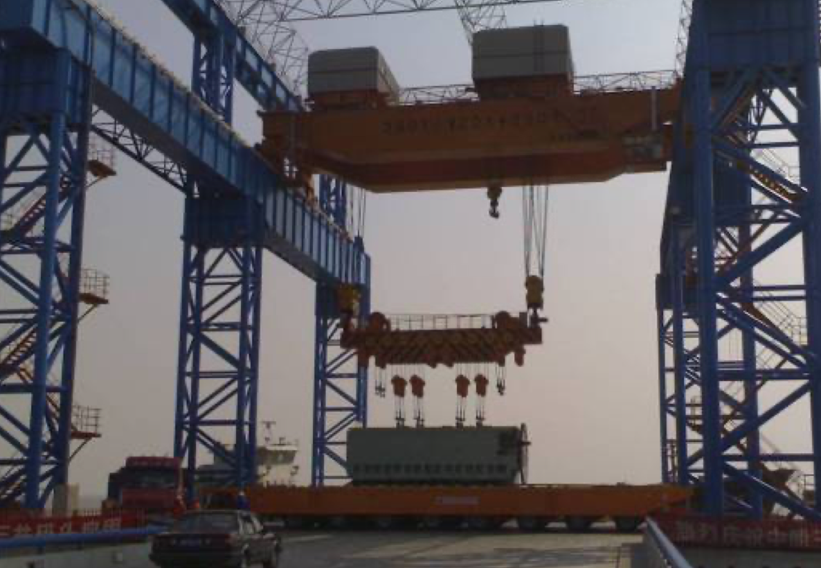 公司設(shè)計(jì)制造的所有橋機(jī)及門機(jī)的起升小車系消化吸收國(guó)外先進(jìn)技術(shù),結(jié)合我國(guó)當(dāng)時(shí)的配套水平,綜合研究院多年的技術(shù)研制經(jīng)驗(yàn),遵照GB/T3811-2008《起重機(jī)設(shè)計(jì)規(guī)范》、GB/T14405-2011《通用橋式起重機(jī)》等標(biāo)準(zhǔn),同時(shí)參照國(guó)外有關(guān)起重機(jī)標(biāo)準(zhǔn)及歐洲搬運(yùn)協(xié)會(huì)主流橋式起重機(jī)機(jī)型研制而成,節(jié)能減排,經(jīng)濟(jì)環(huán)保,特別適合地下廠房、新型工廠及大噸位貴重物件的吊裝、搬運(yùn)就位工作。公司首臺(tái)臺(tái)橋機(jī)為1990年研發(fā)、1992年投入生產(chǎn)的寧波北侖電廠80/20t橋式起重機(jī),公司首臺(tái)臺(tái)門機(jī)為1994年向富春江發(fā)電廠提供的2×20t尾水門機(jī)。近三十年的發(fā)展,已向國(guó)內(nèi)外眾多優(yōu)質(zhì)客戶提供千余臺(tái)橋機(jī)和門機(jī)設(shè)備,是目前業(yè)內(nèi)最先進(jìn)、最成熟的低凈空小車結(jié)構(gòu)。目前制造過(guò)的單小車橋機(jī)最大額定起重量為800t,雙小車橋機(jī)最大額定起重量為500t+500t,具備1500噸橋機(jī)的設(shè)計(jì)制造能力;制造過(guò)的門式起重機(jī)最大額定起重量為900t的造船龍門吊。